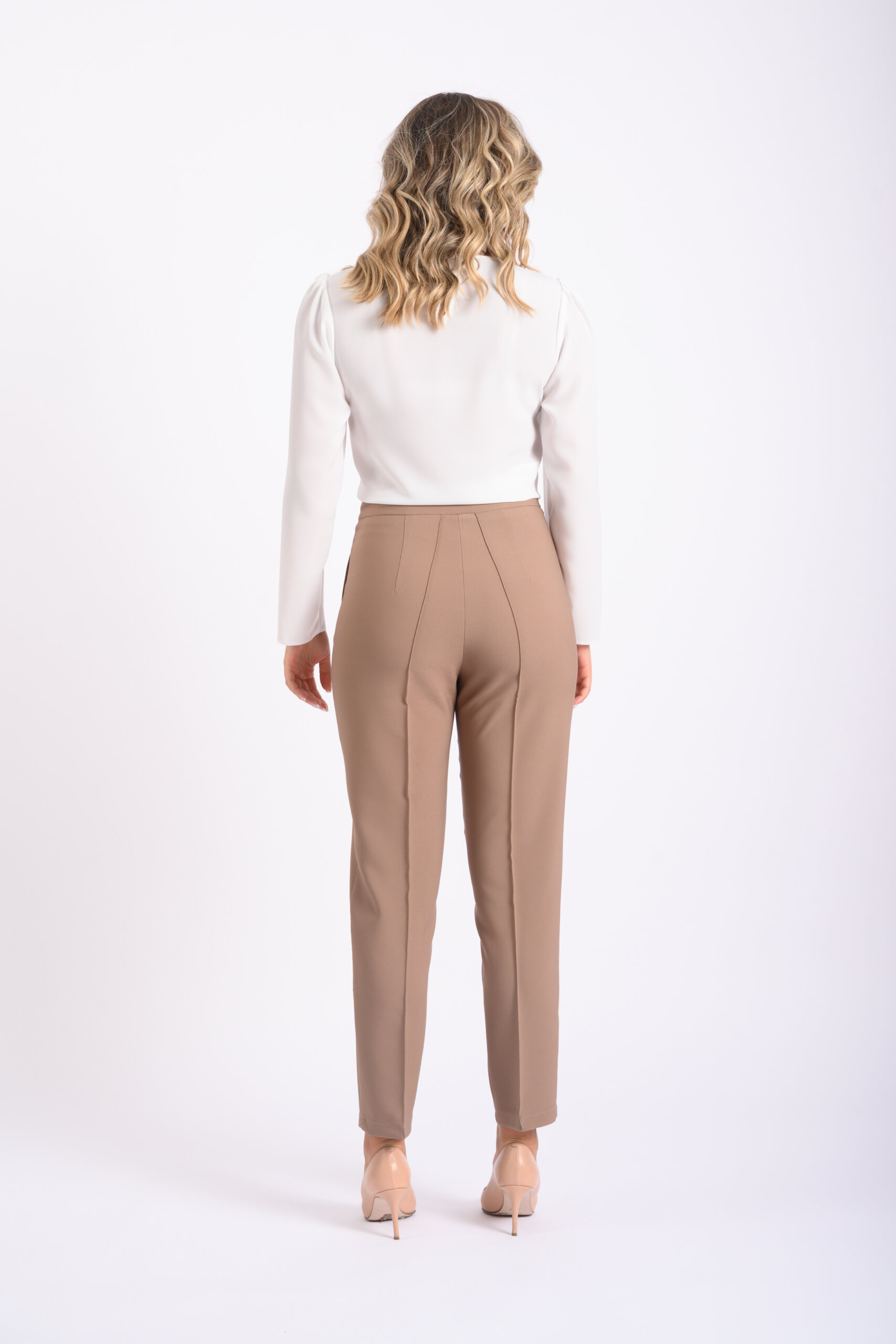 Pantalonul este conic,cu tighele decorative. La față are un șliț cu fermoar,iar în talie un brâu prevăzut cu moș și babă metalic pentru închidere.