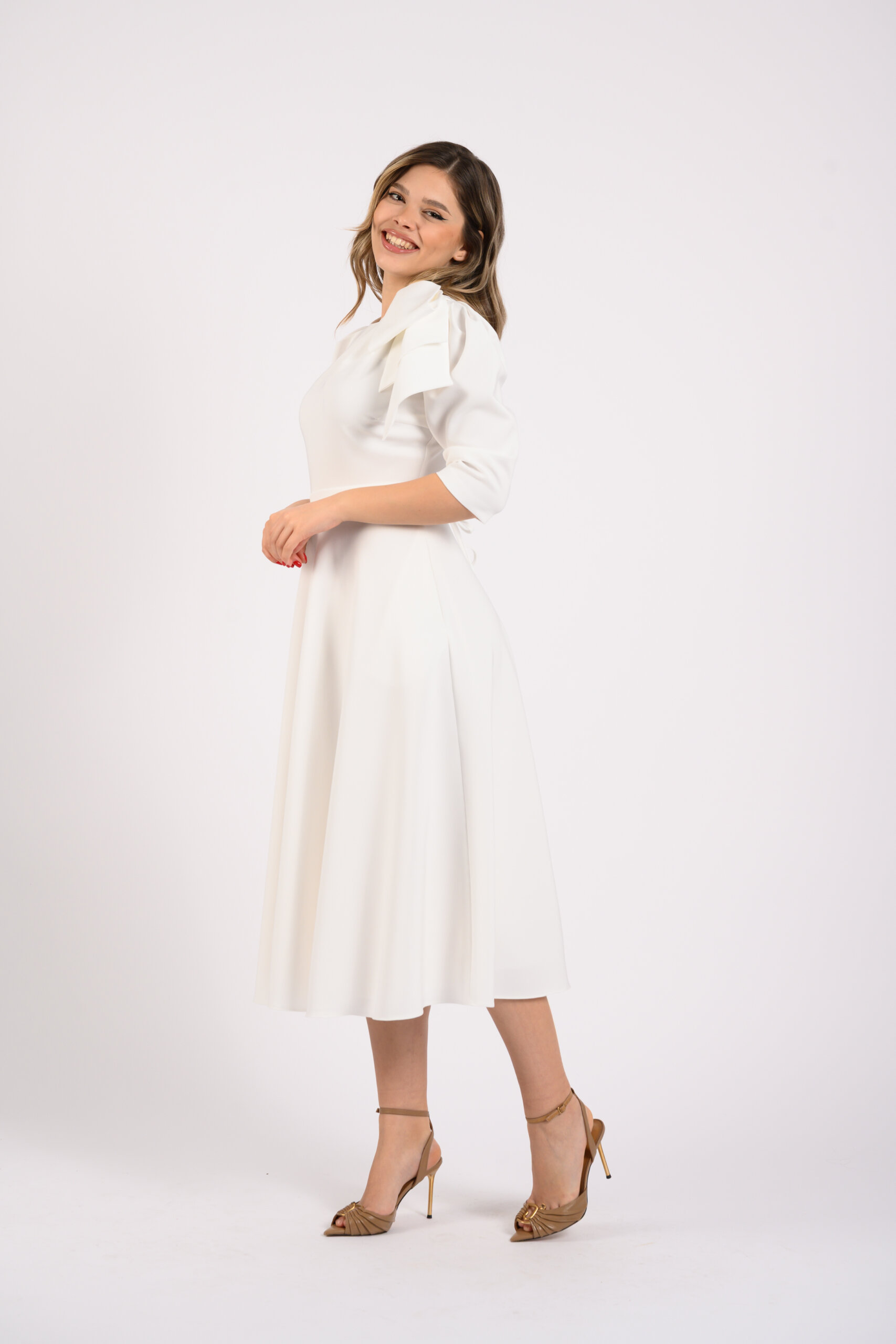 ROCHIE MIDI ALBĂ,CU PLIURI ȘI FUNDĂ PE UMĂR