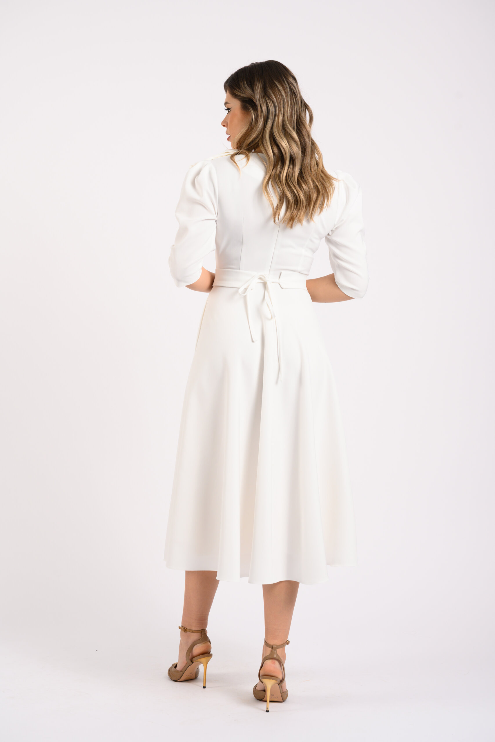 Rochia este midi,tăiată în talie,în partea de jos având un croi tip semicloș. Decolteul este rotund,pe umărul stâng având niște pliuri și o fundă asimetrică. Mânecile sunt 3/4,la spate are un fermoar ca sistem de închidere,iar în talie un cordon detașabil.
