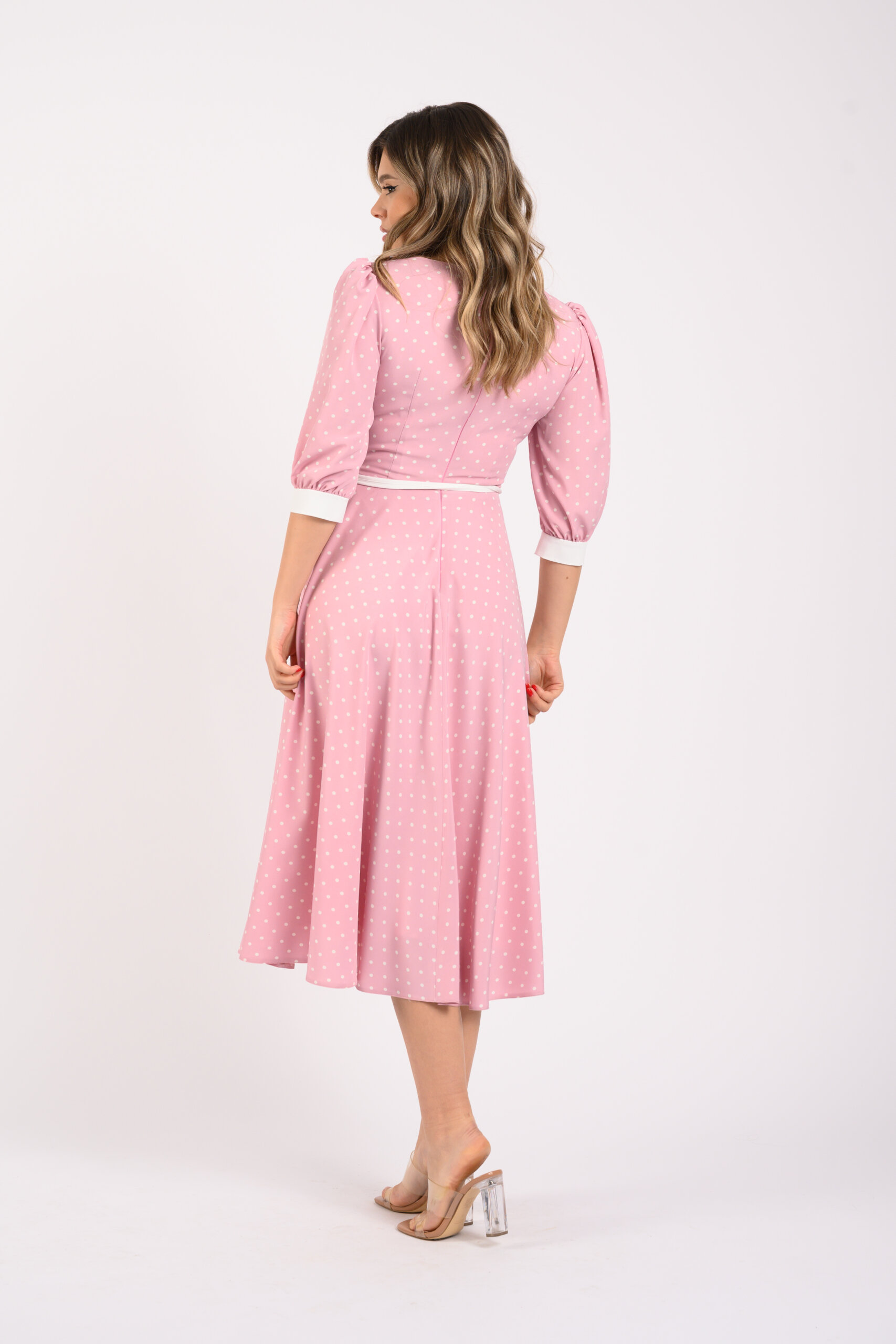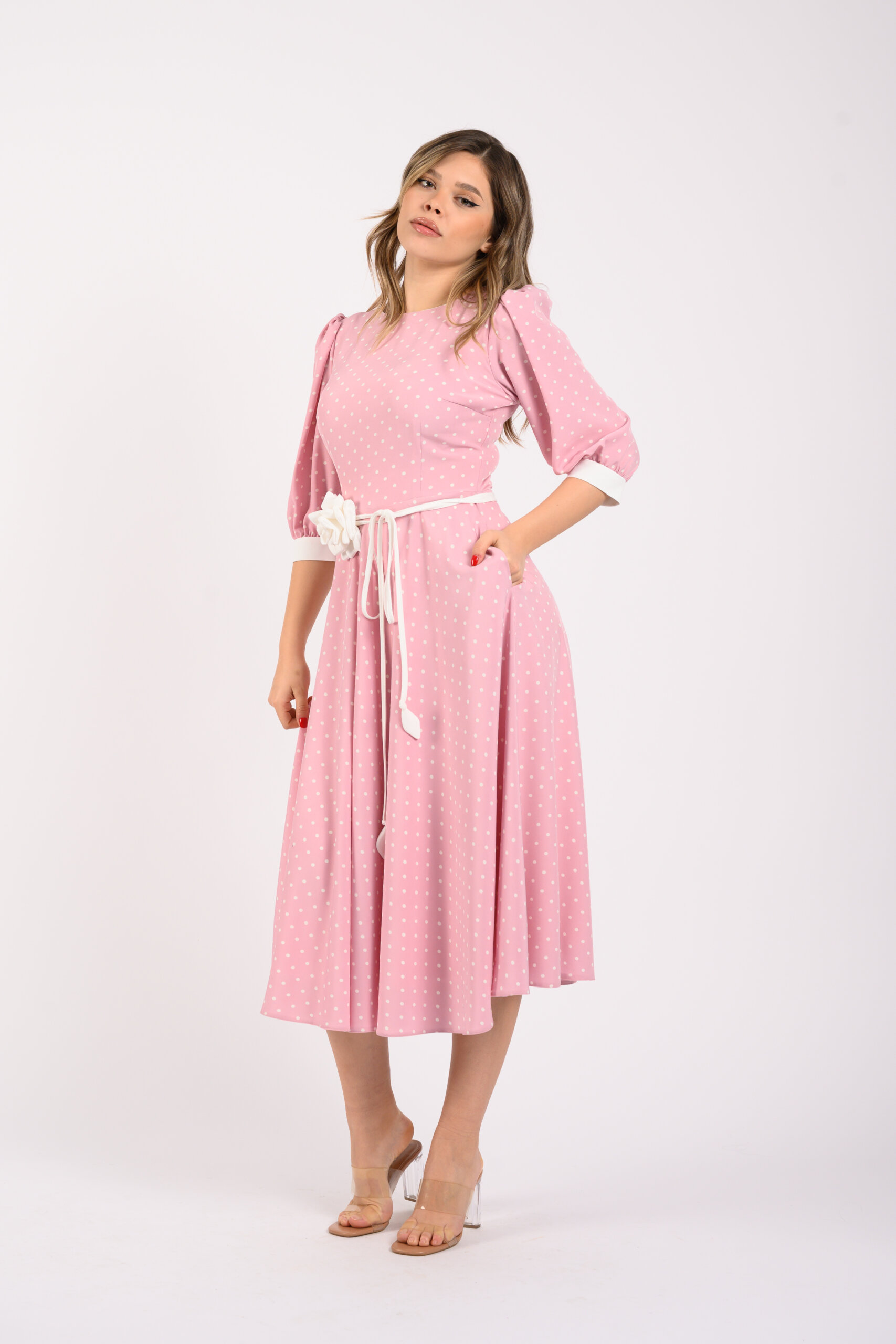 Rochia este midi,dintr-un voal mai plin imprimat cu buline,tăiată în talie,în partea de jos având un croi de semicloș. Decolteul este rotund,mânecile 3/4 cu un ușor volum,adunate într-o manșetă albă. La spate,rochia are un fermoar ca sistem de închidere.În talie are un cordon detașabil alb,accesorizat cu o floare handmade albă,tip trandafir.