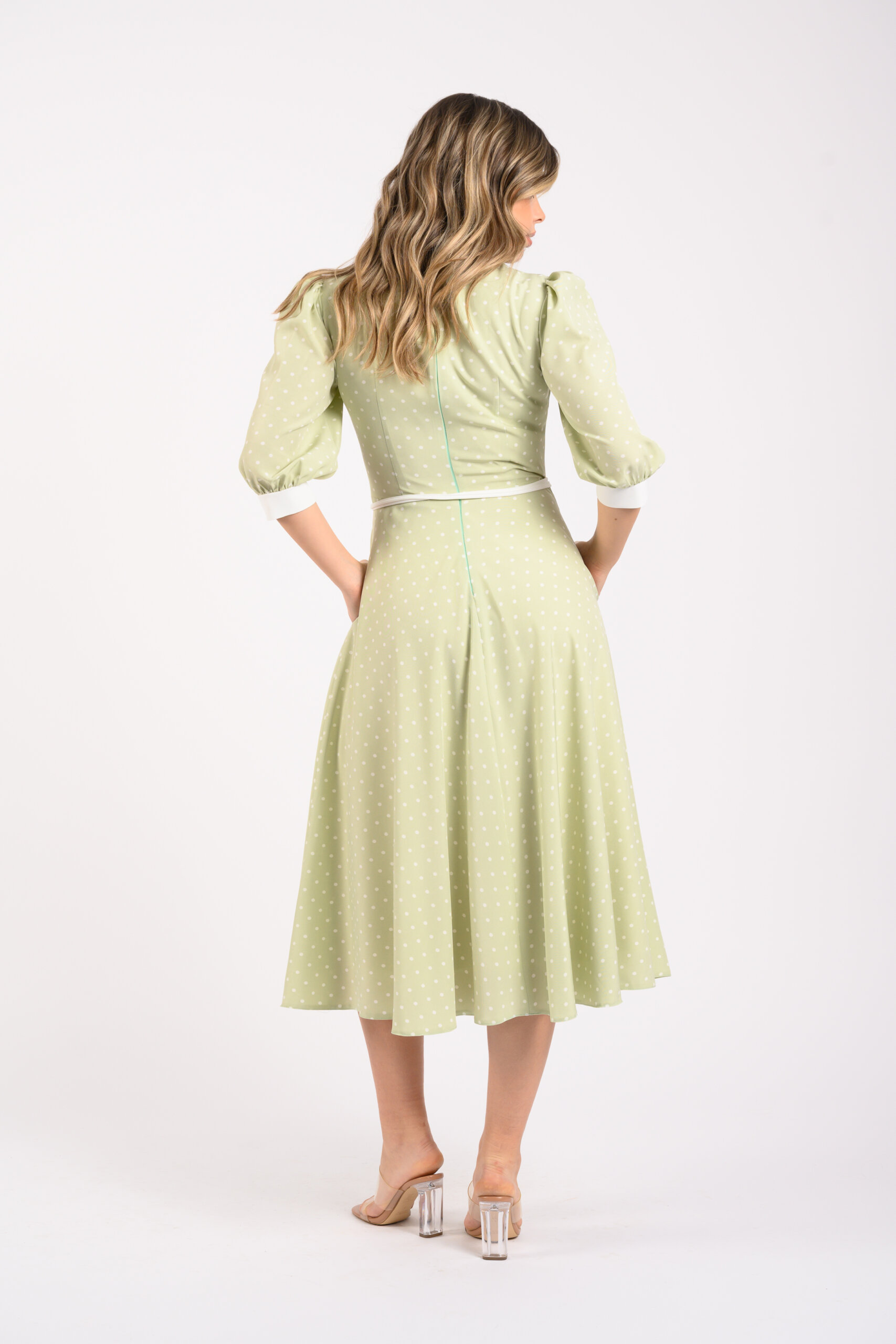 Rochia este midi,dintr-un voal mai plin imprimat cu buline,tăiată în talie,în partea de jos având un croi de semicloș. Decolteul este rotund,mânecile 3/4 cu un ușor volum,adunate într-o manșetă albă. La spate,rochia are un fermoar ca sistem de închidere.În talie are un cordon detașabil alb,accesorizat cu o floare handmade albă,tip trandafir.