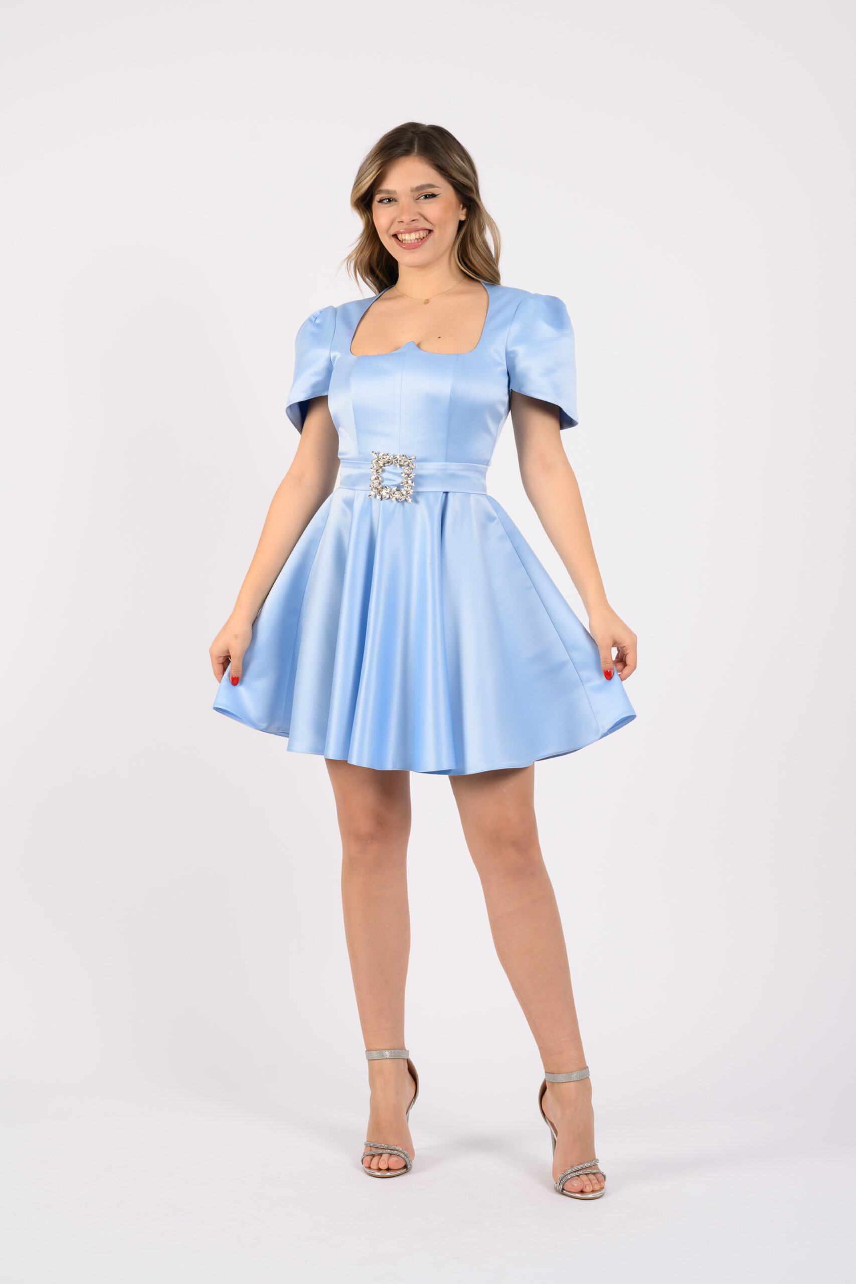 ROCHIE SCURTĂ BLEU,TIP CLOȘ DIN TAFTA SATINATĂ